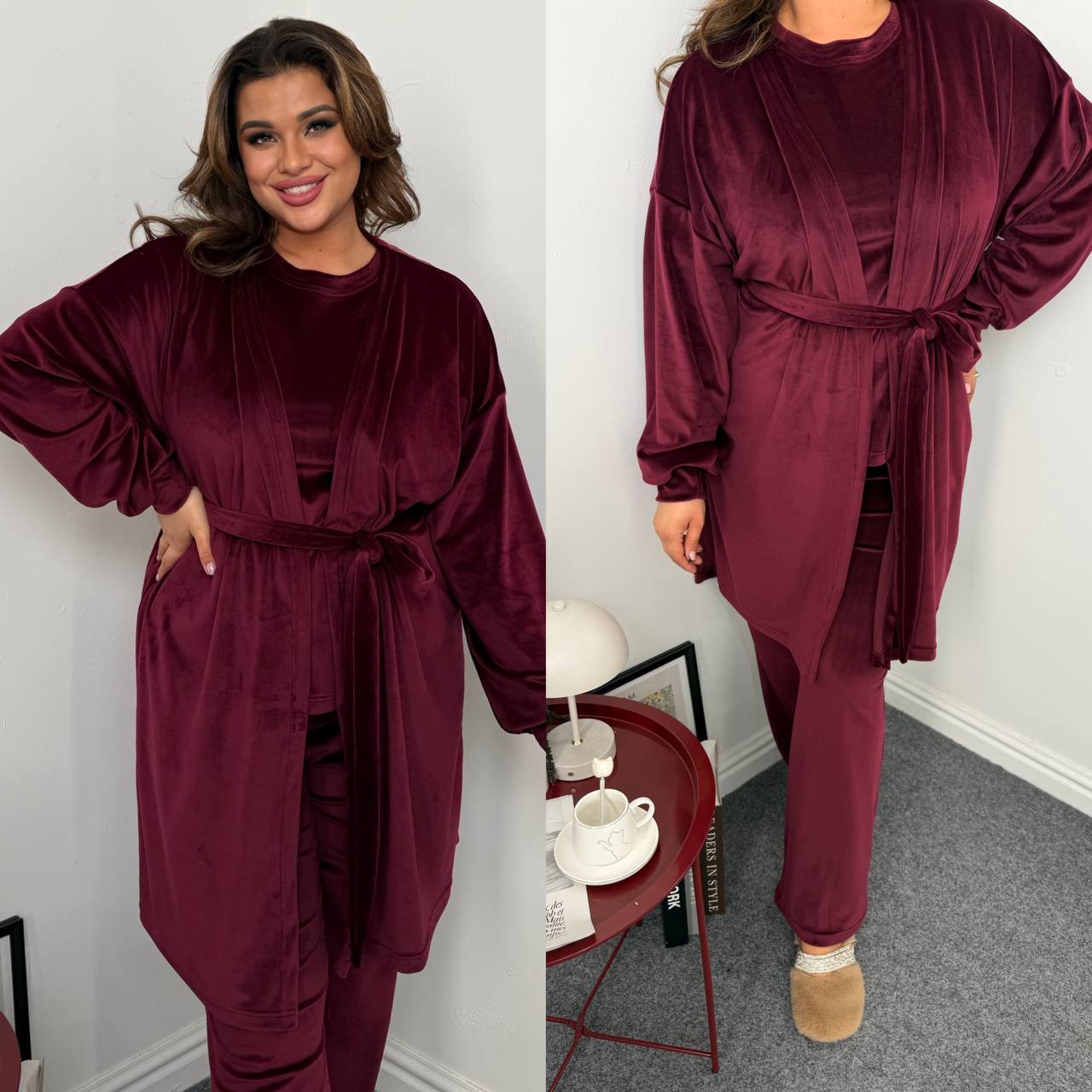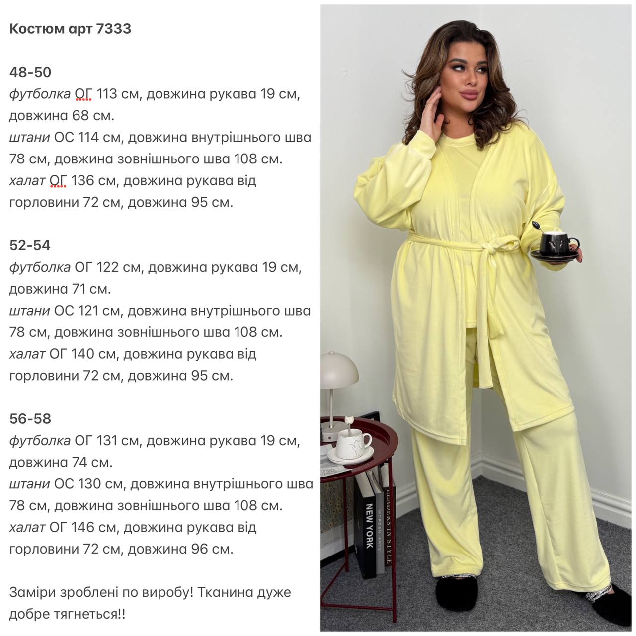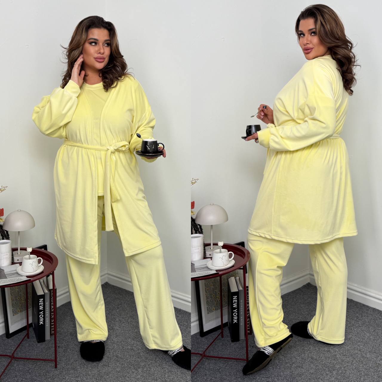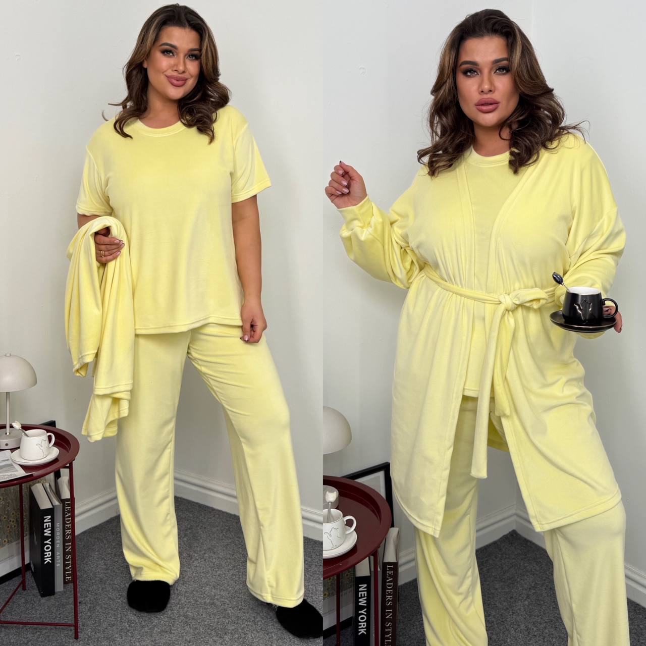 Ідеальний мʼякий костюм. Футболка короткий рукав. Штани із кишенями,талія на резинці. Халат із поясом непришивним.