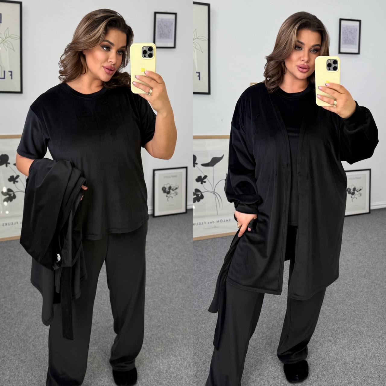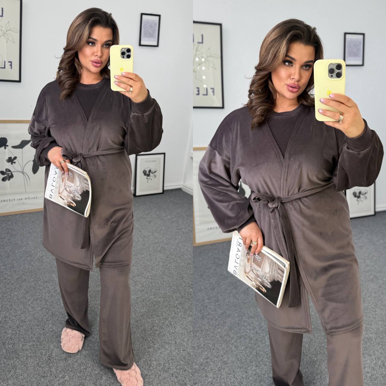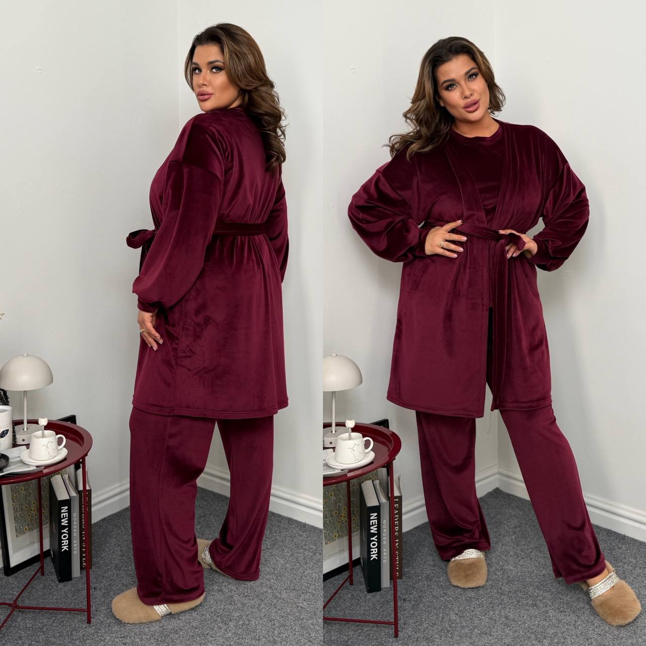 Ідеальний мʼякий костюм. Футболка короткий рукав. Штани із кишенями,талія на резинці. Халат із поясом непришивним.