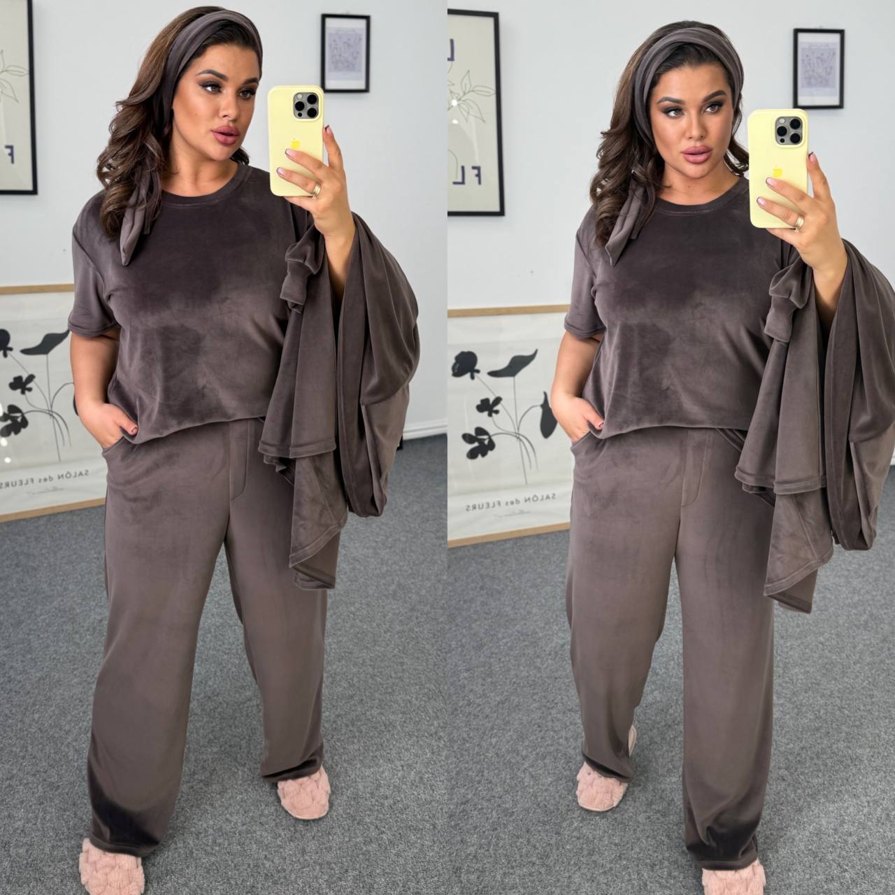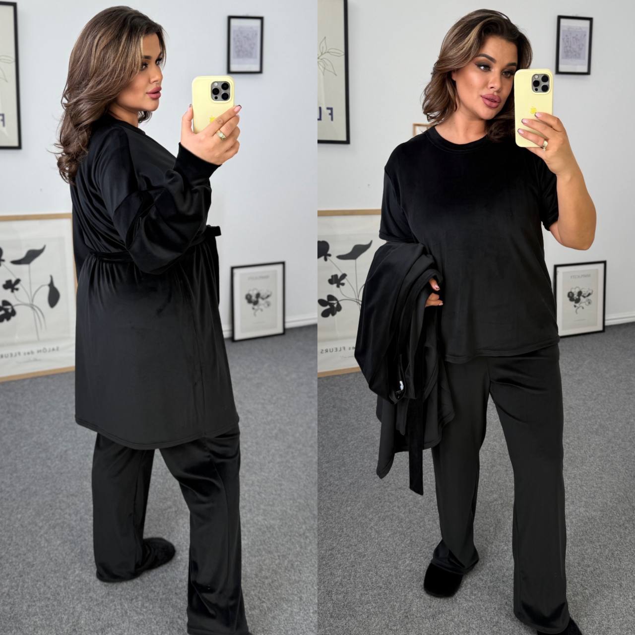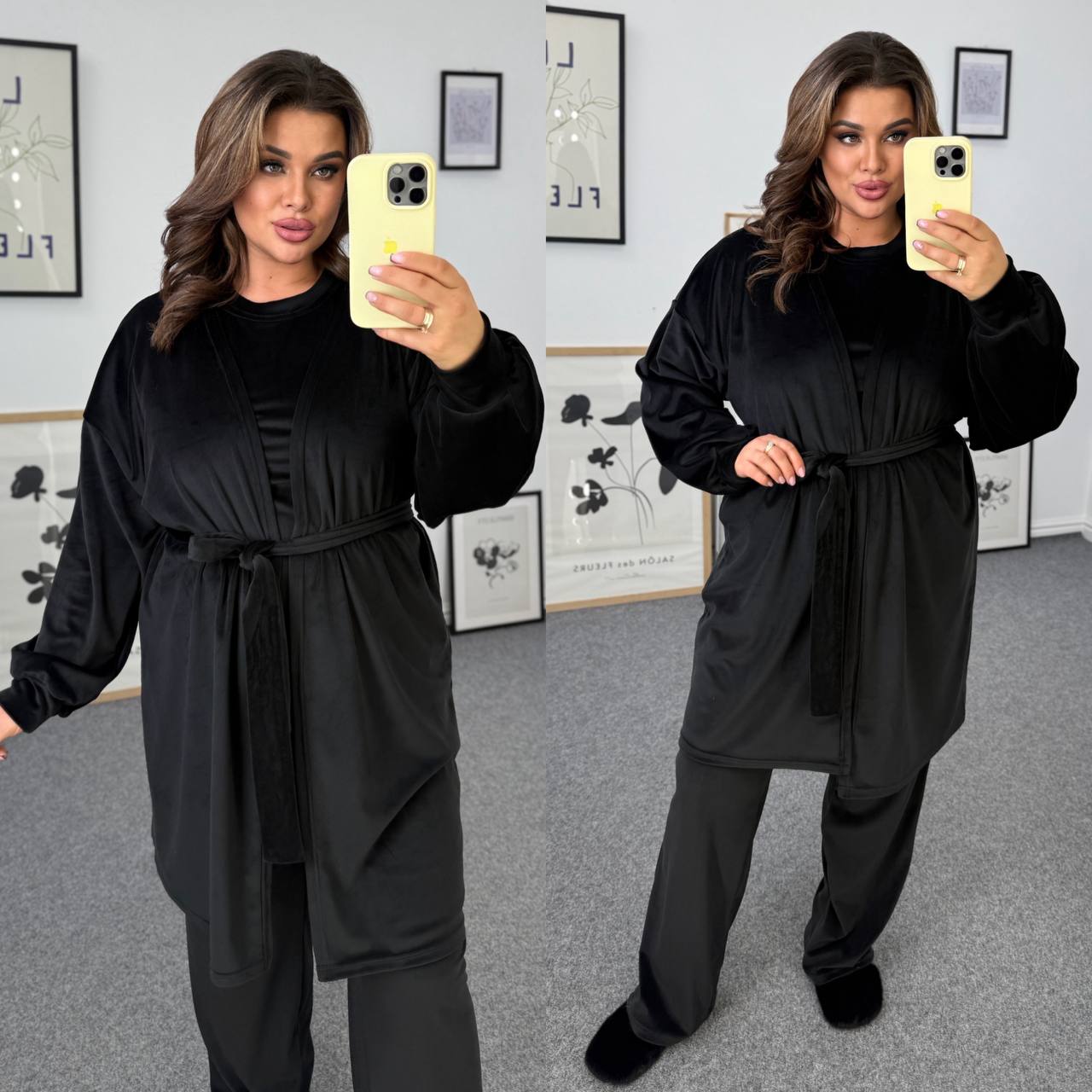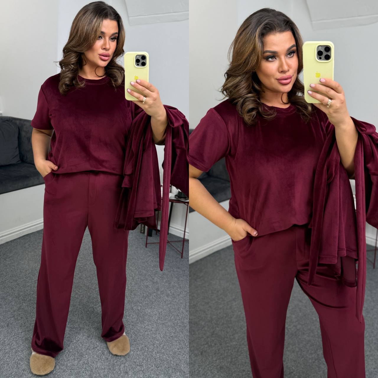 Ідеальний мʼякий костюм. Футболка короткий рукав. Штани із кишенями,талія на резинці. Халат із поясом непришивним.