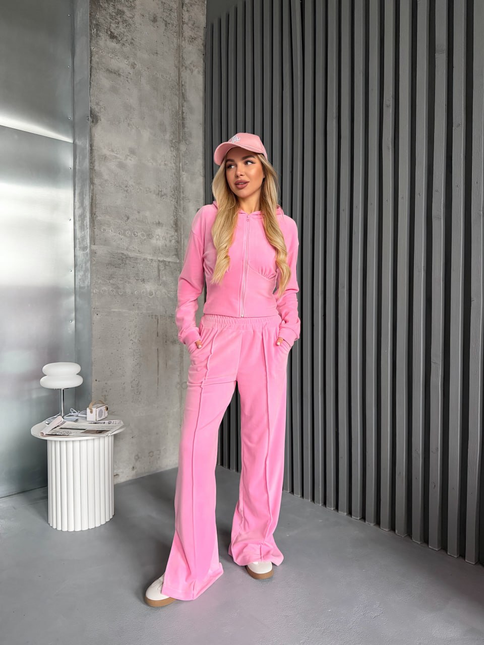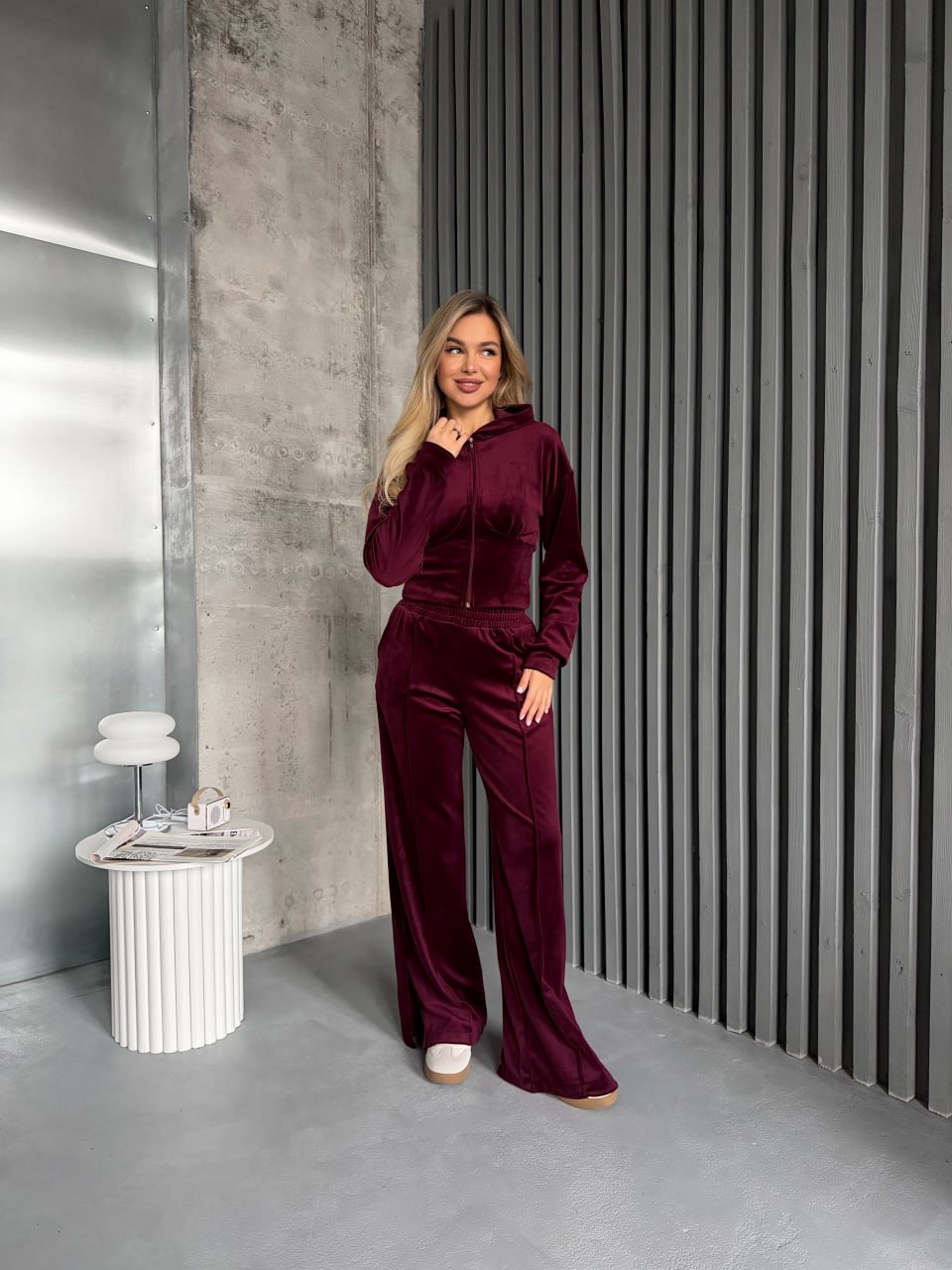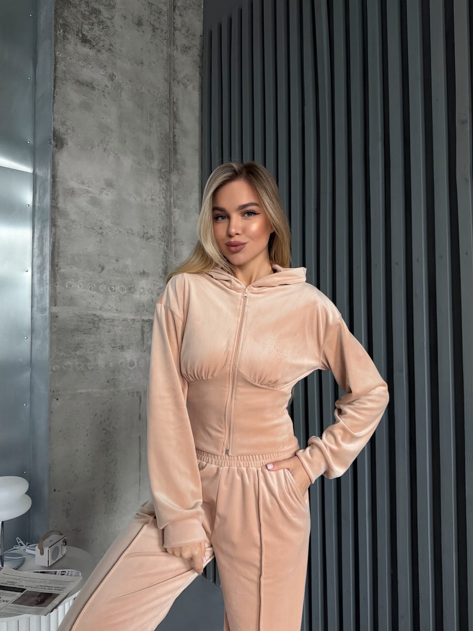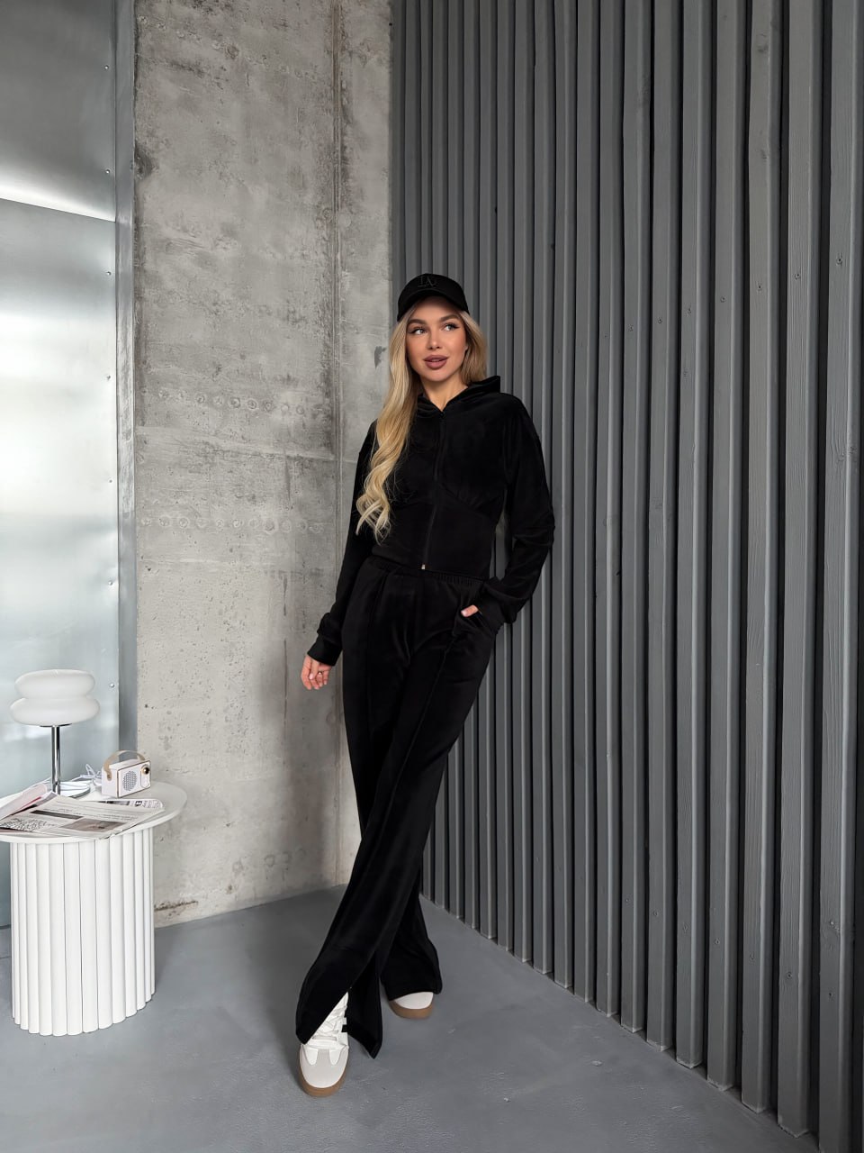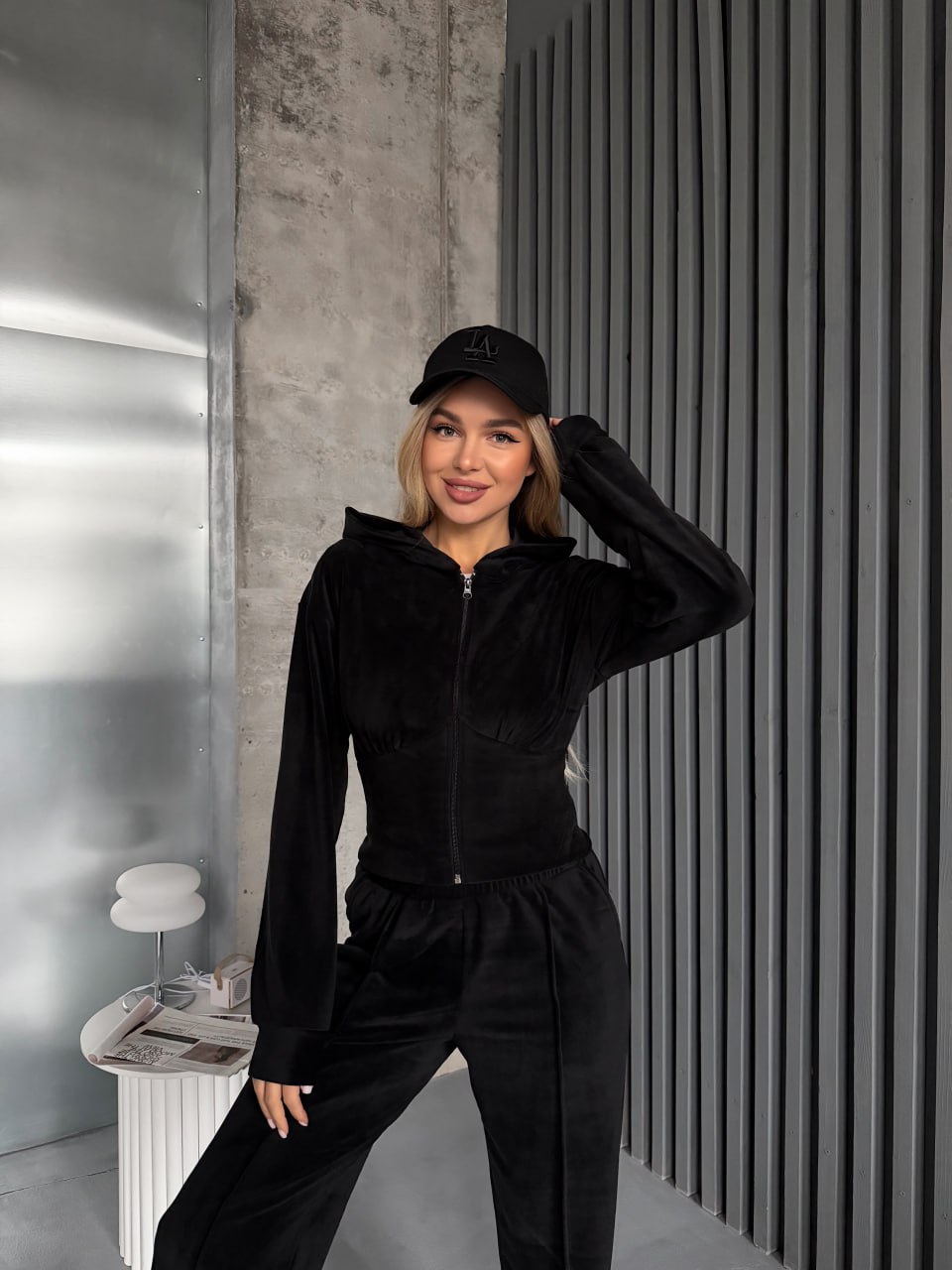 Опис: Стильний спортивний костюм із м’якого велюру з укороченою кофтою з капюшоном.
