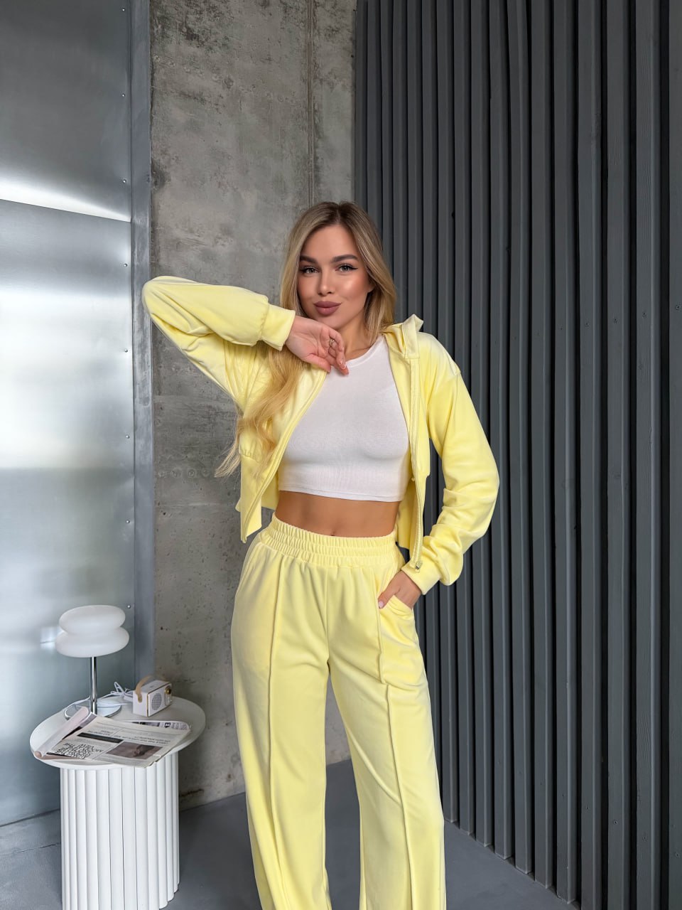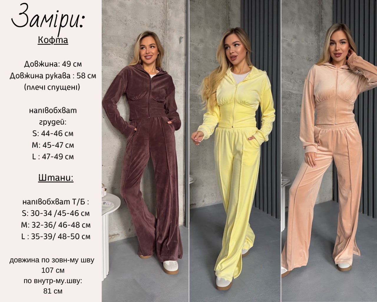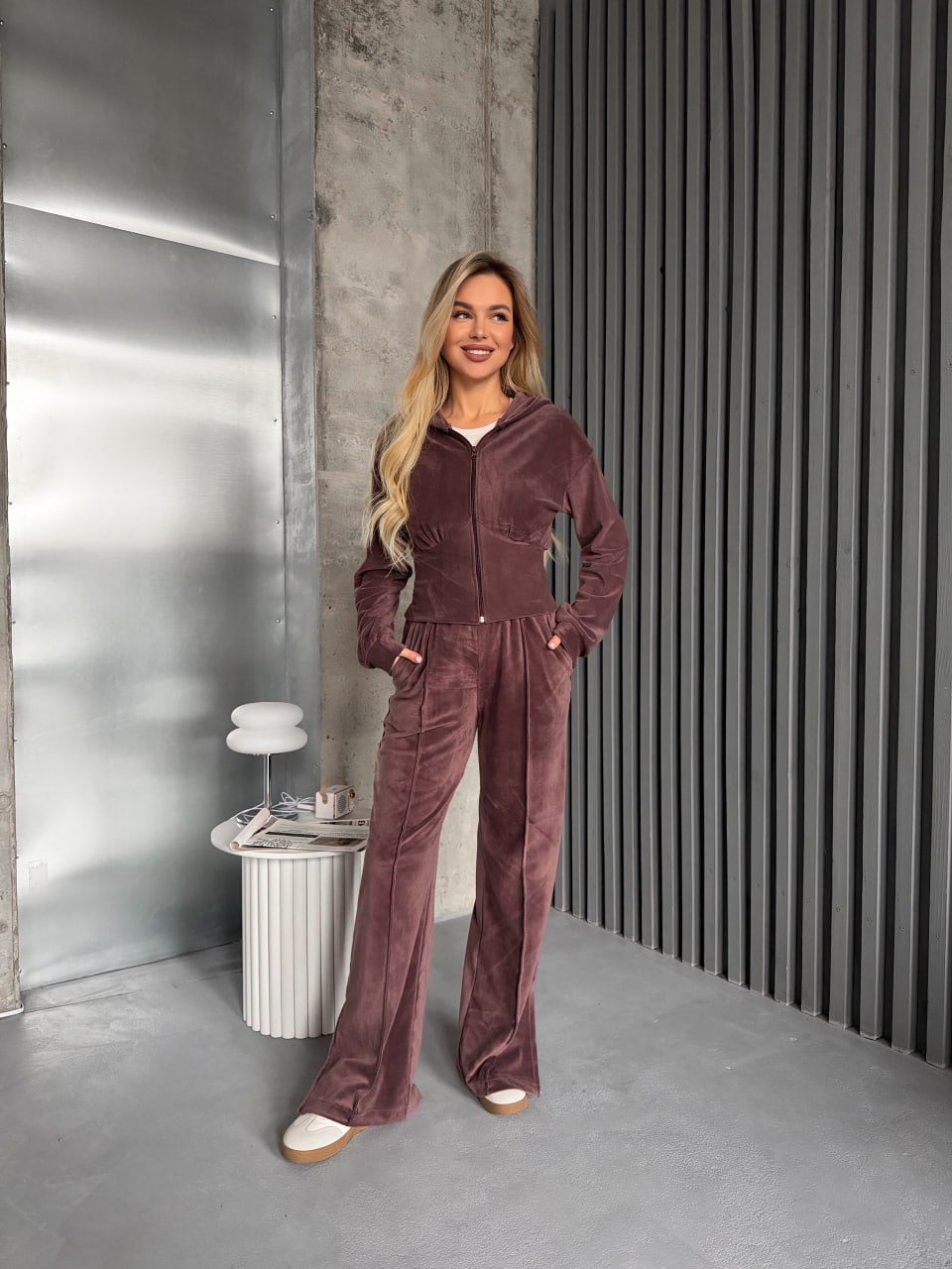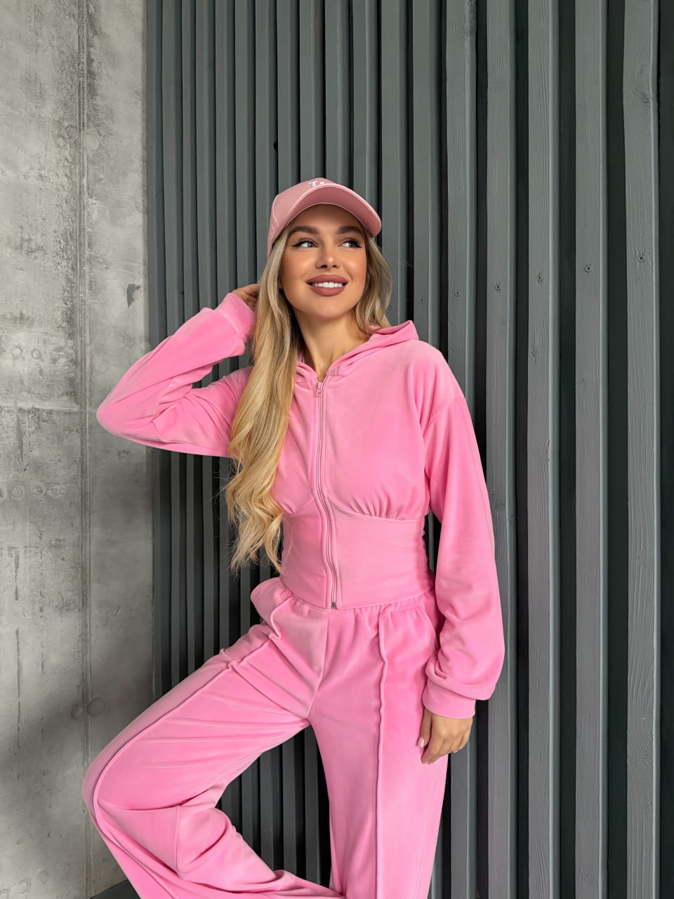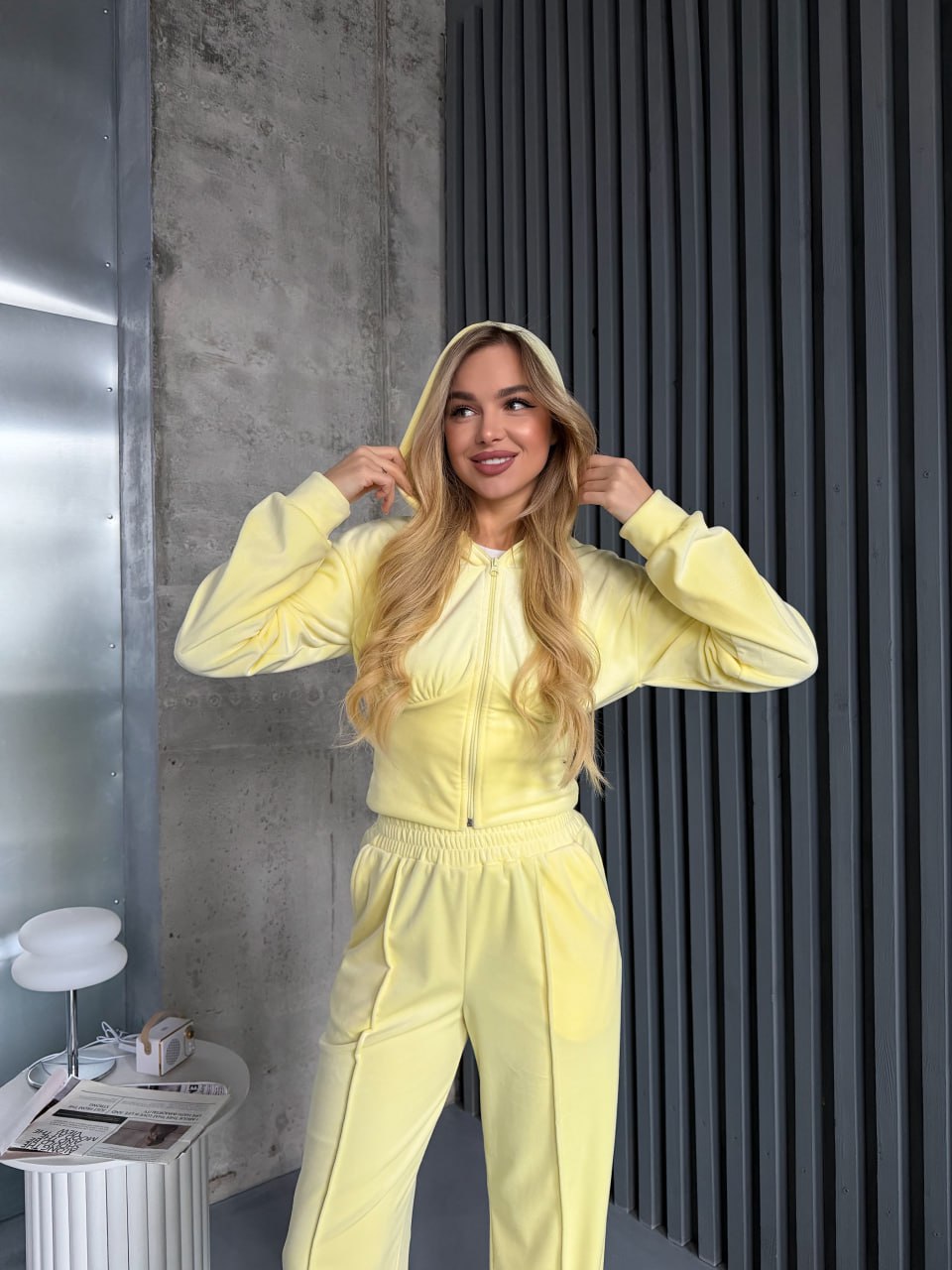 Опис: Стильний спортивний костюм із м’якого велюру з укороченою кофтою з капюшоном.