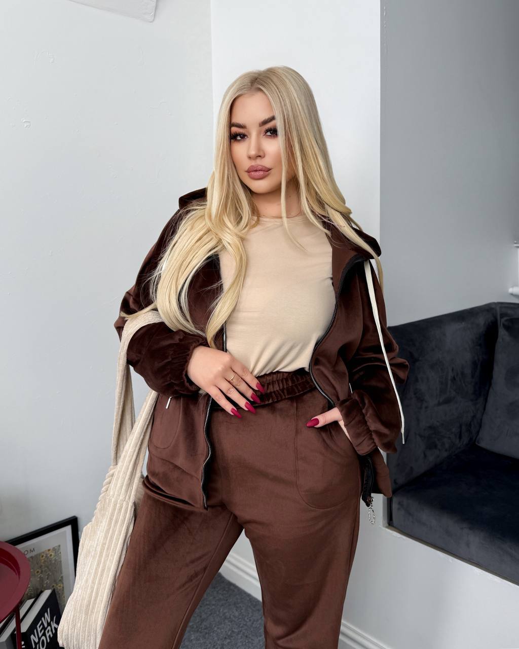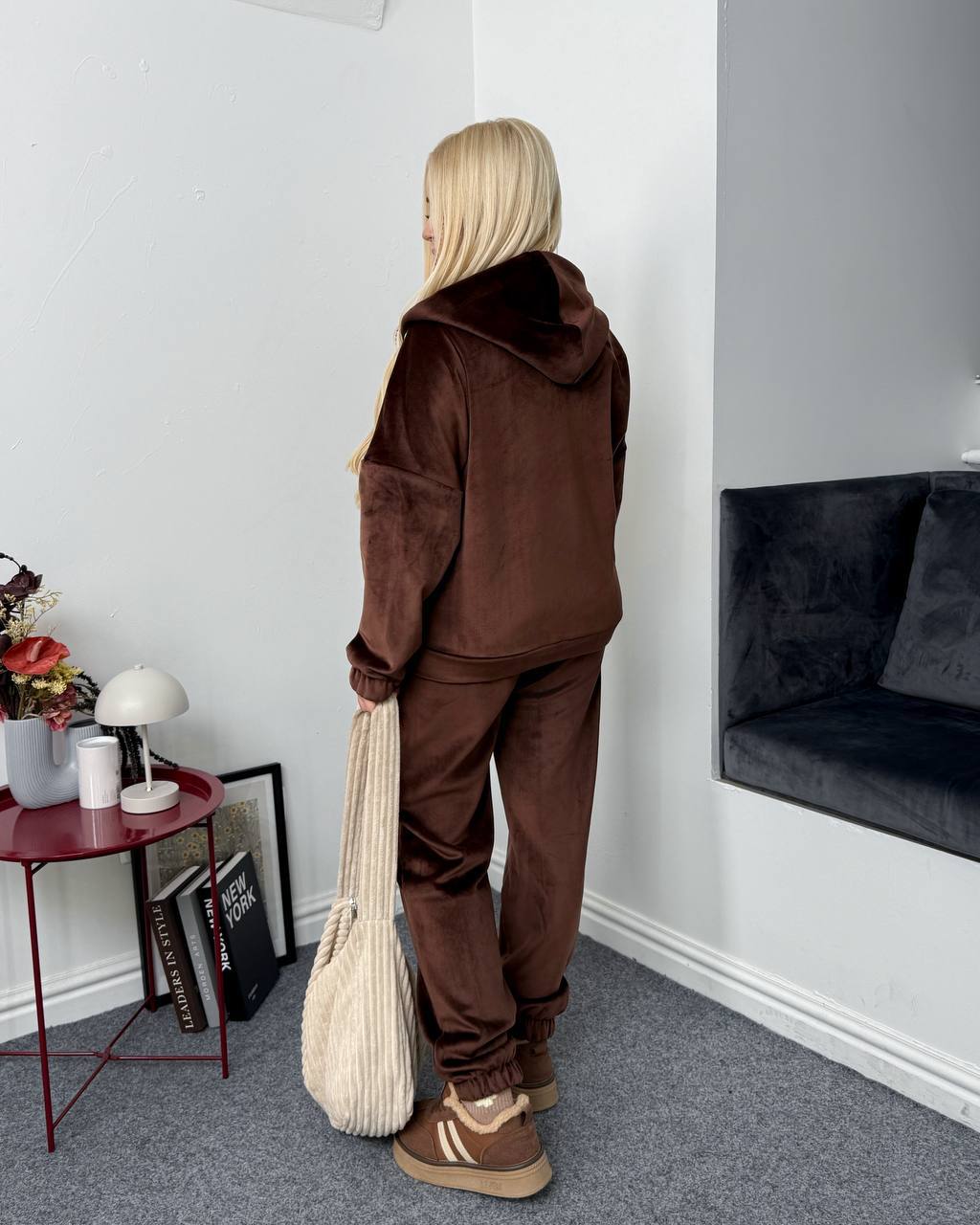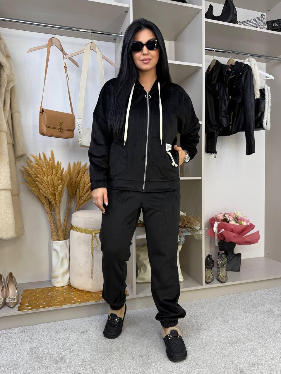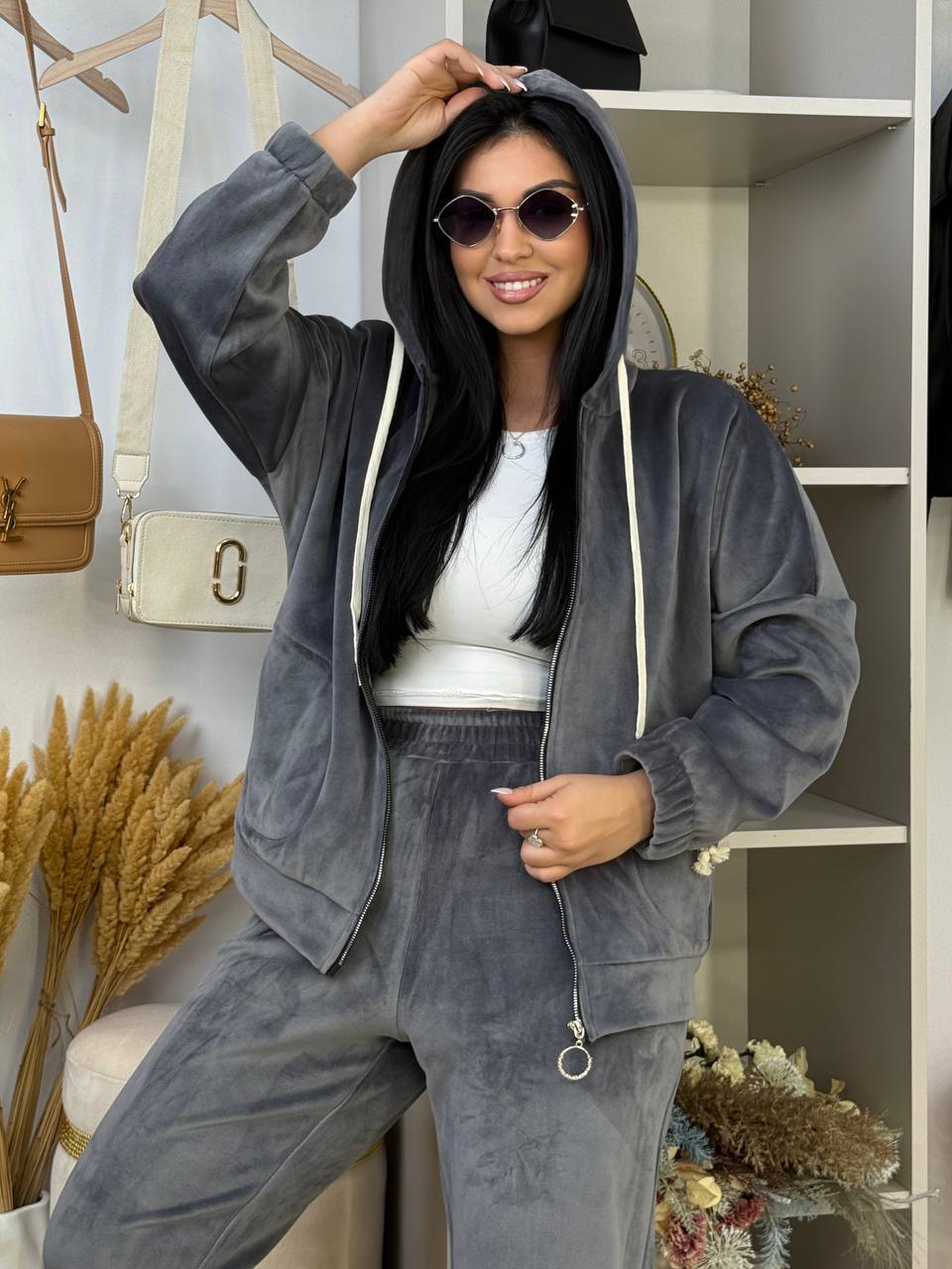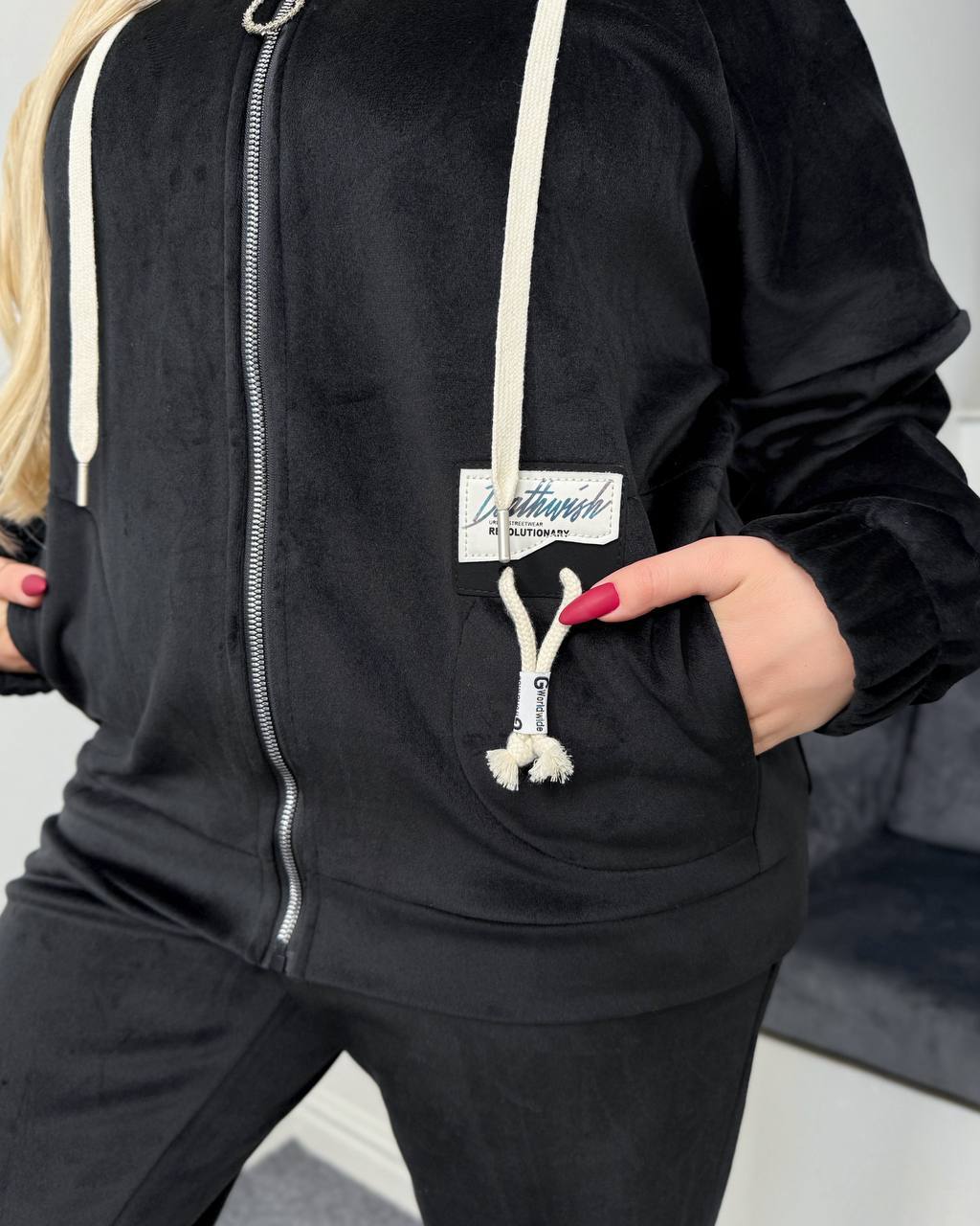 Велюровий теплий костюм на флісовій основі з капюшоном , вільний батник на блискавці з кишенями в боках Штани високої посадки, пояс і низ штанів на резинці з кишеням в бічних швах.
