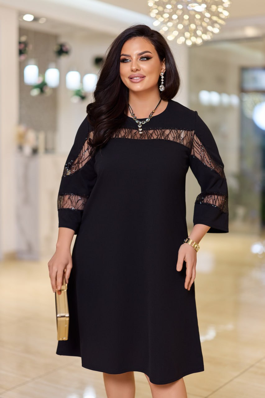 Ефектна жіноча сукня А-силуету. Це святкове, але в той же час елегантне вбрання прикрашене вставками з сітки з блискучим напиленням і здатне підкреслити індивідуальність і шляхетність своєї володарки. На спинці оброблена крапелька на навісну петлю та гудзик. Силует сукні чудово приховує нюанси фігури та підкреслює переваги.