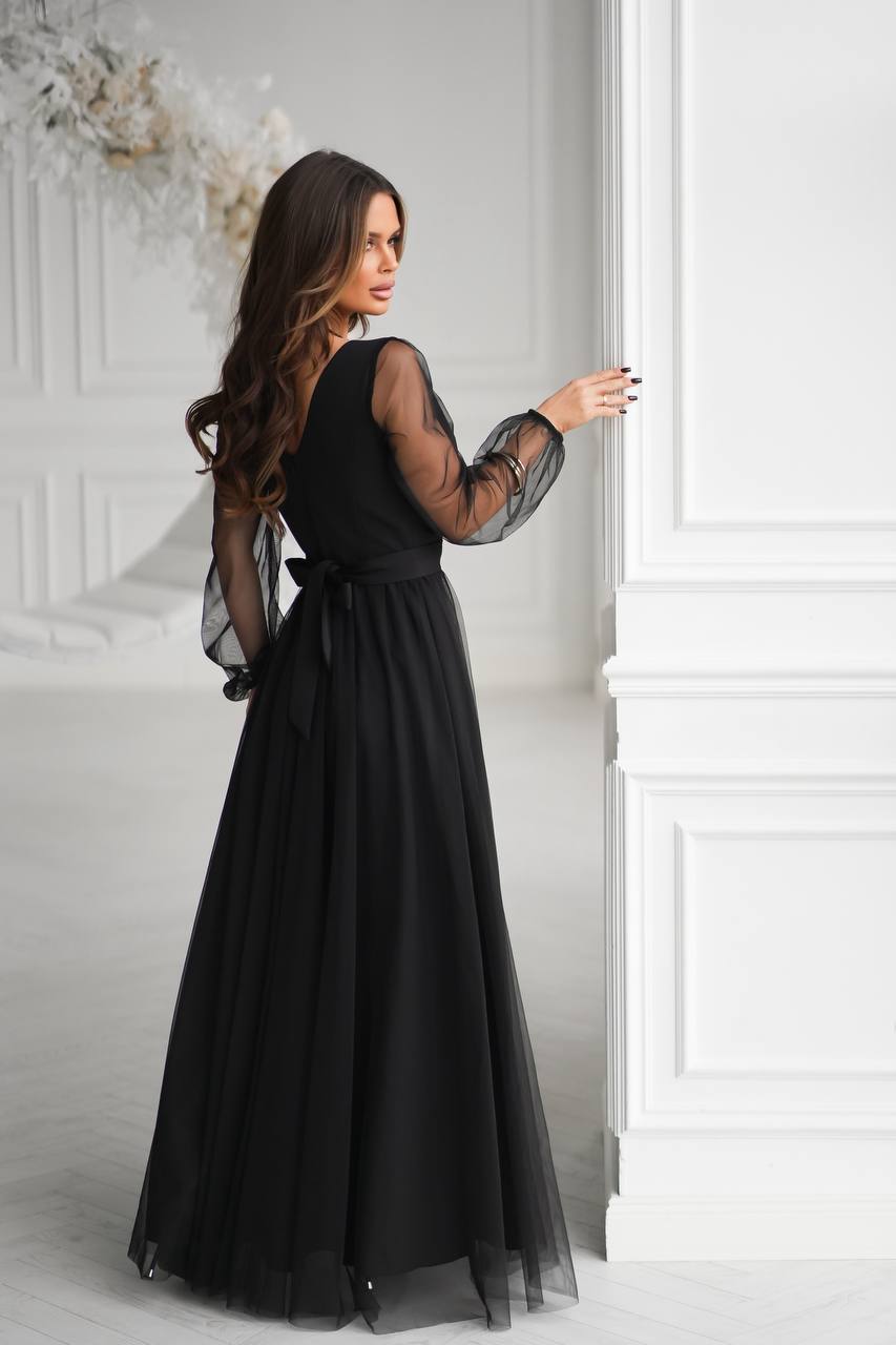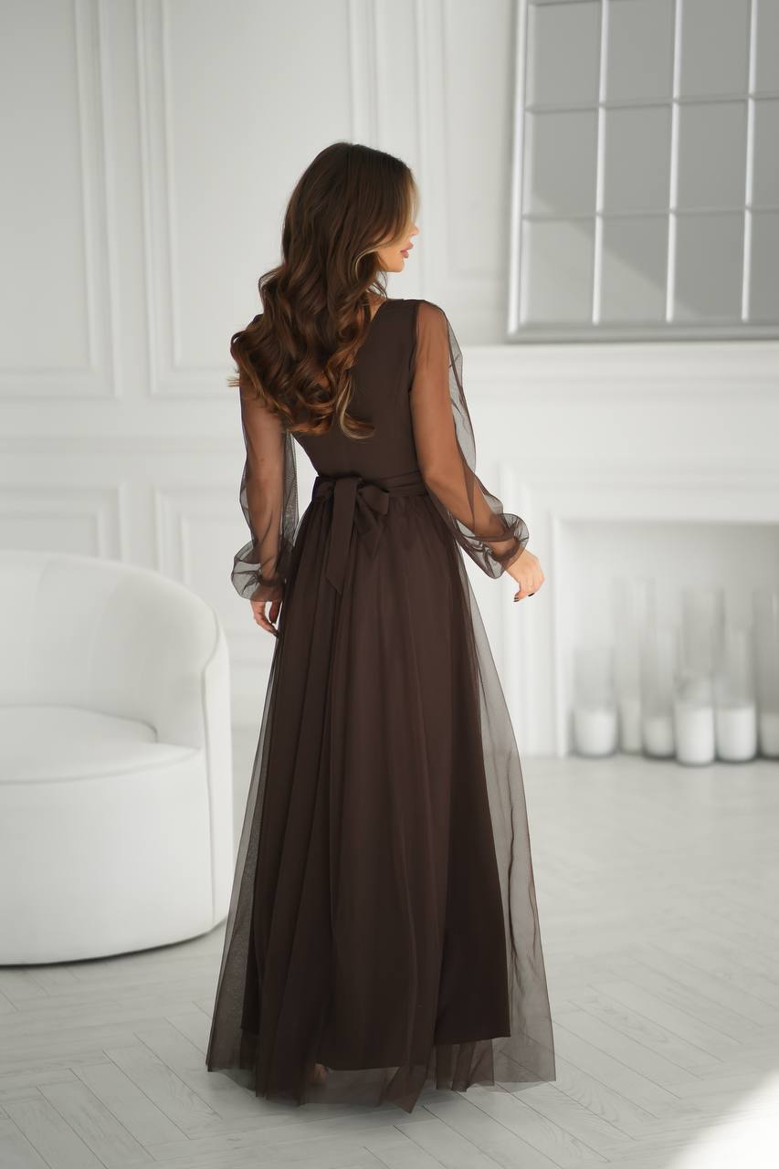 Витончена довга сукня з м’якою сіткою та високим розрізом на нозі