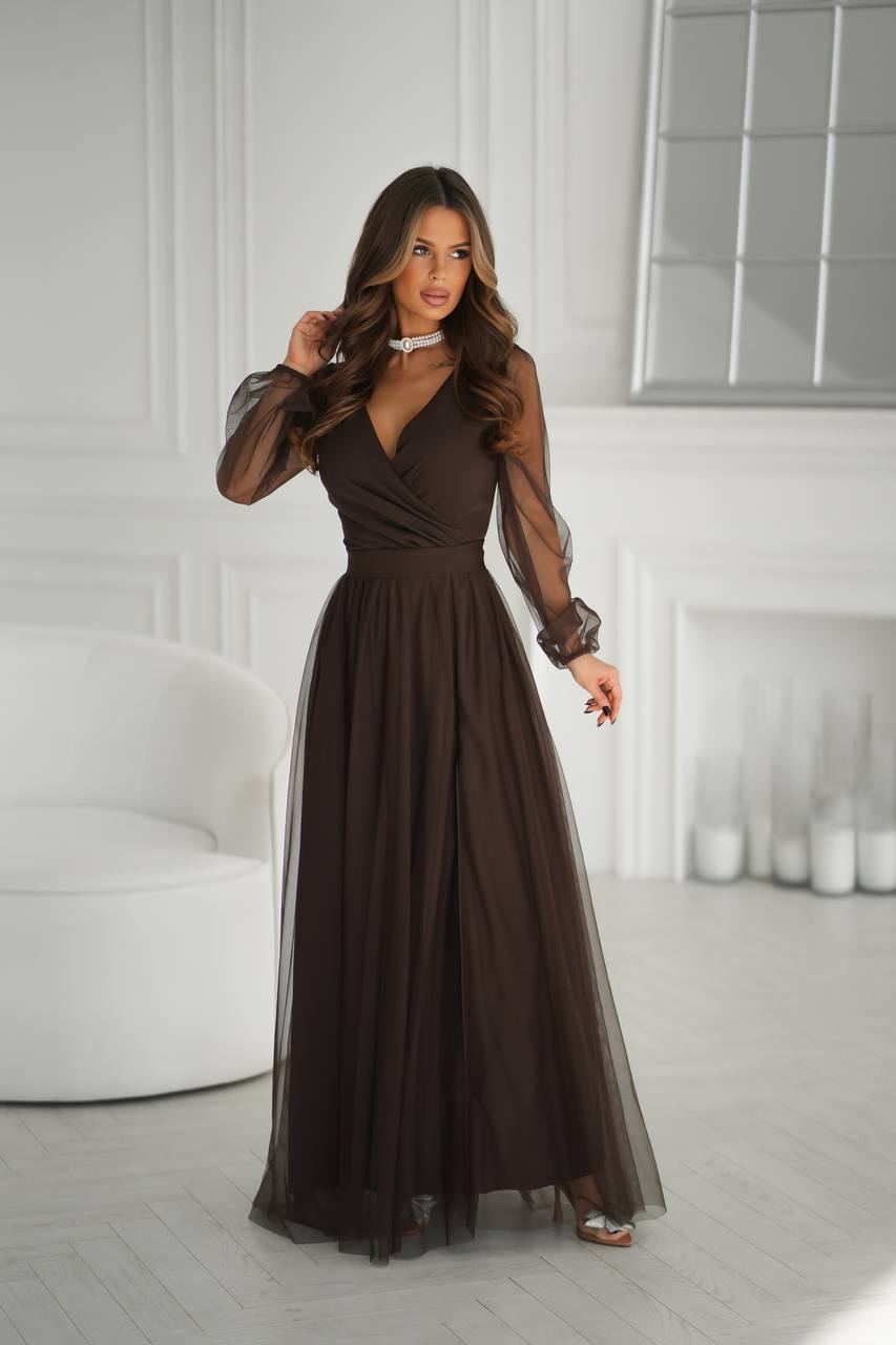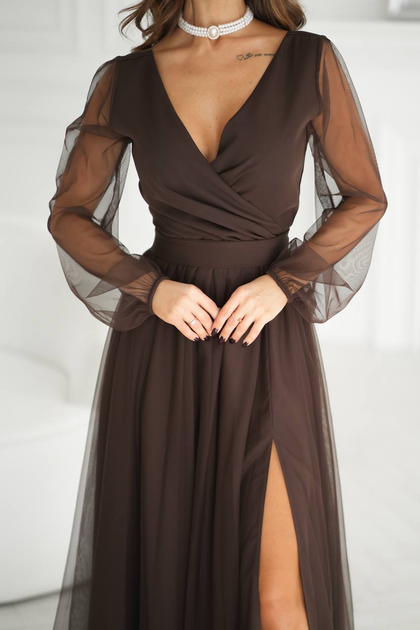 Витончена довга сукня з м’якою сіткою та високим розрізом на нозі. Модель має V-подібний виріз на грудях на запах, що формує жіночну та виразну лінію декольте.