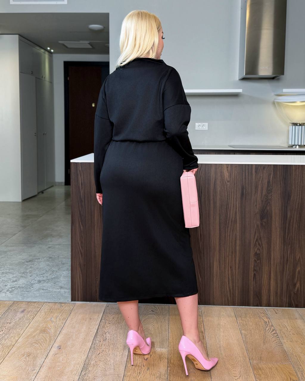 Сукня довжиною міді з цільнокроєною стійкою . Довгими рукавами зі спущеною лінією плеча.