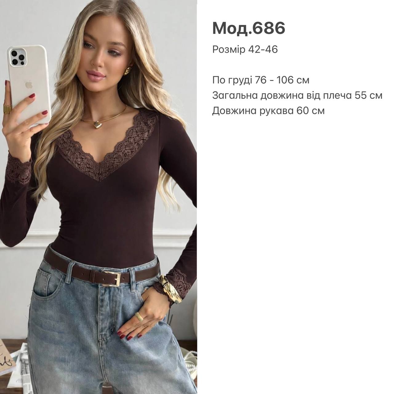М’яка трикотажна кофтинка з ніжним мереживом по горловині та по низу рукавів. Добре тягнеться, приємна до тіла й комфортна на кожен день.