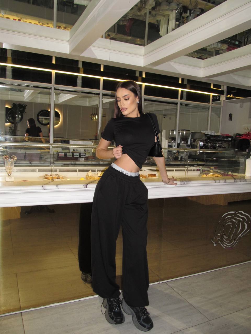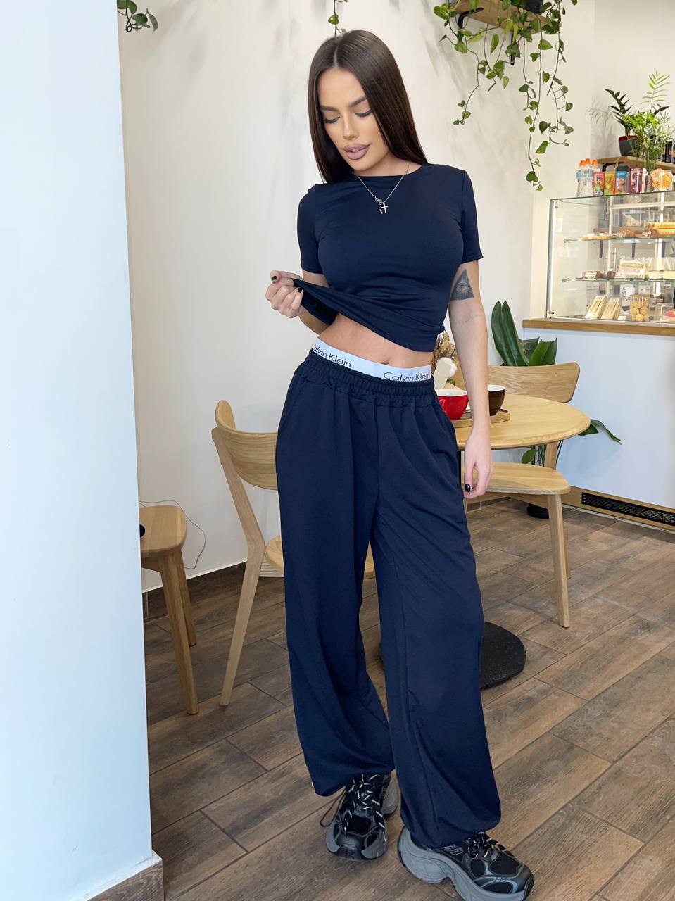 Футболка приталена. Штани палаццо вільного крою, знизу на фіксаторах (можна стягувати).