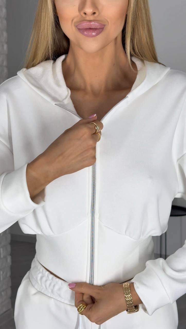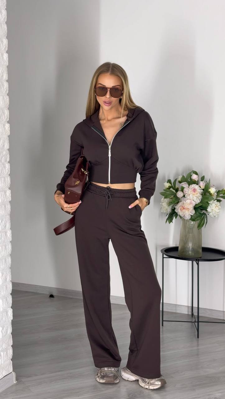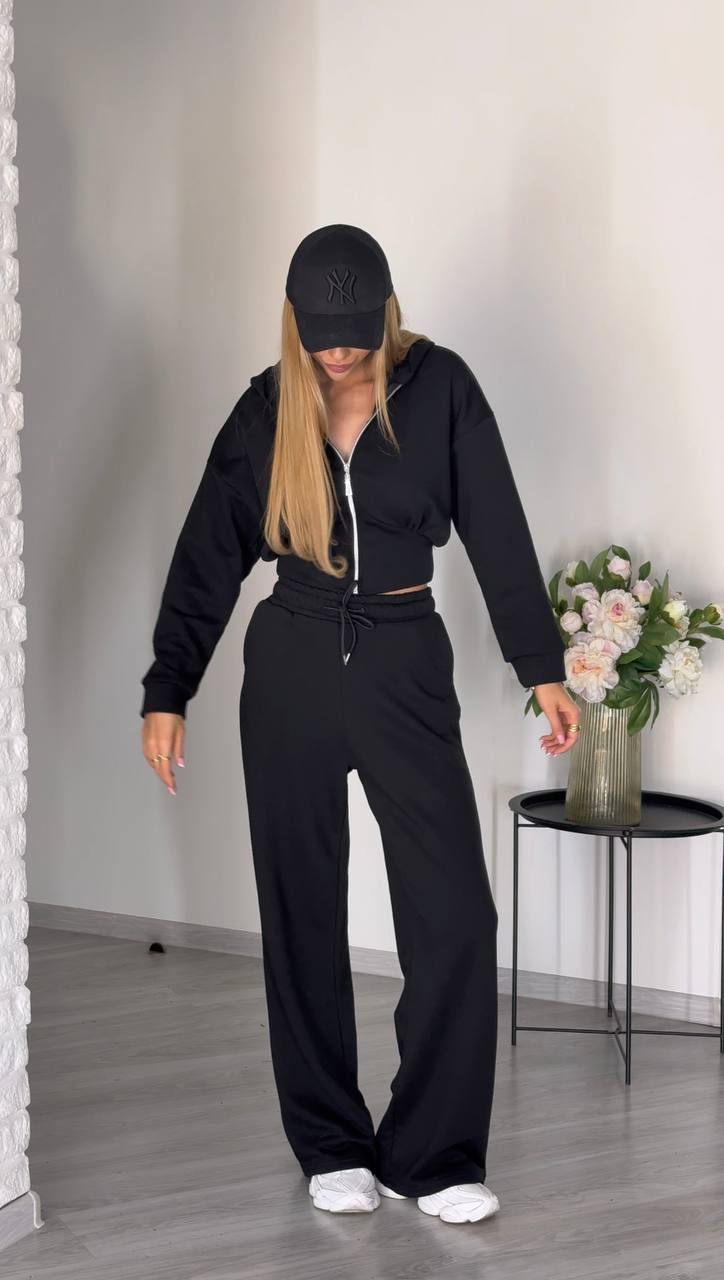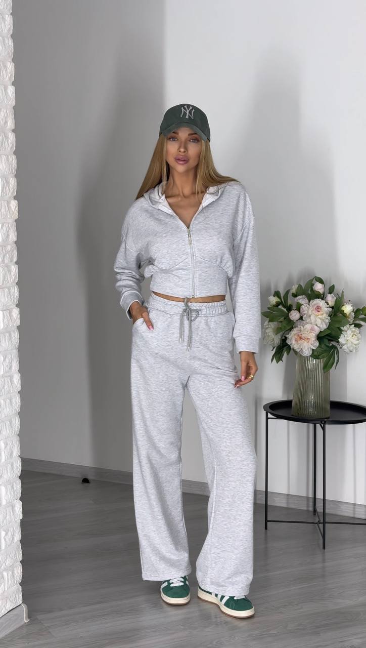 Дуже стильний у цьому сезоні костюм (вкорочений світшот на блискавці та широкі брюки)
