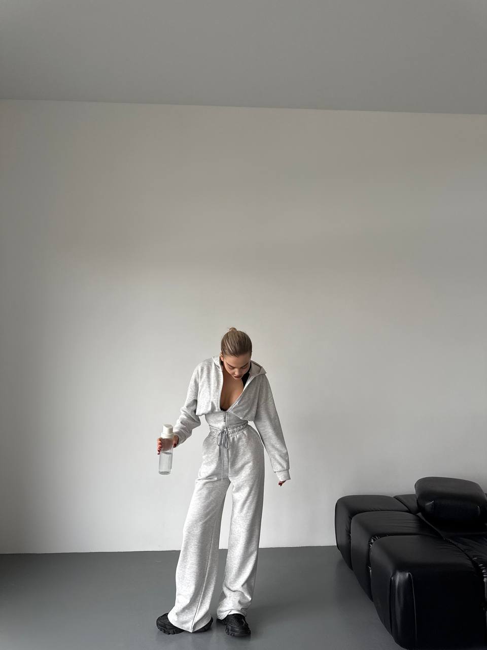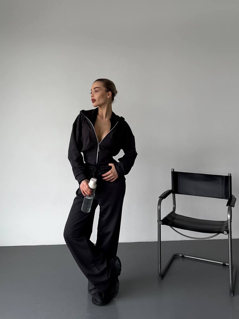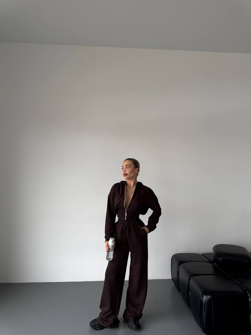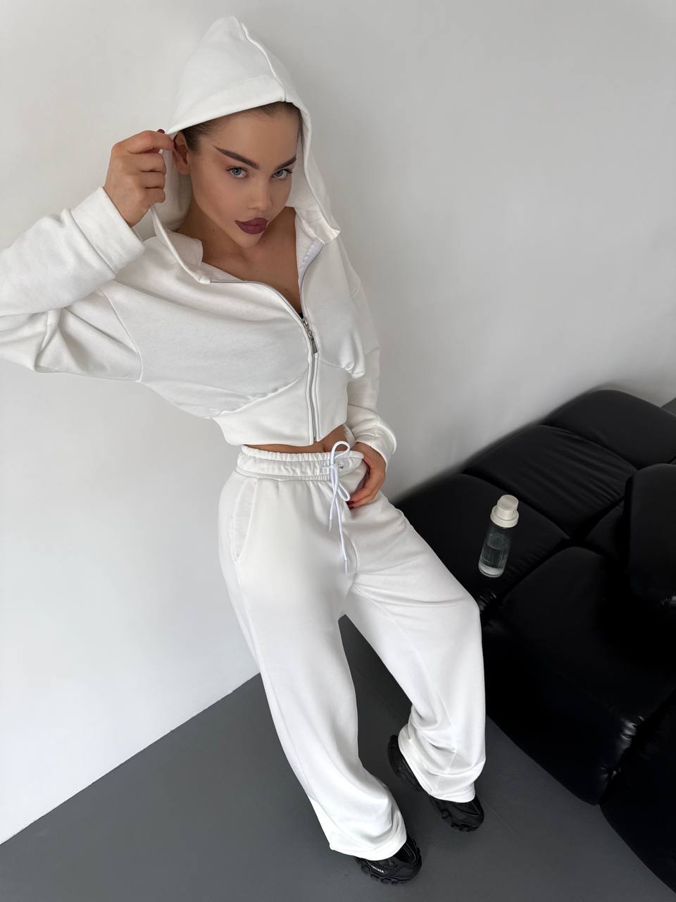 Дуже стильний у цьому сезоні костюм (вкорочений світшот на блискавці та широкі брюки)
